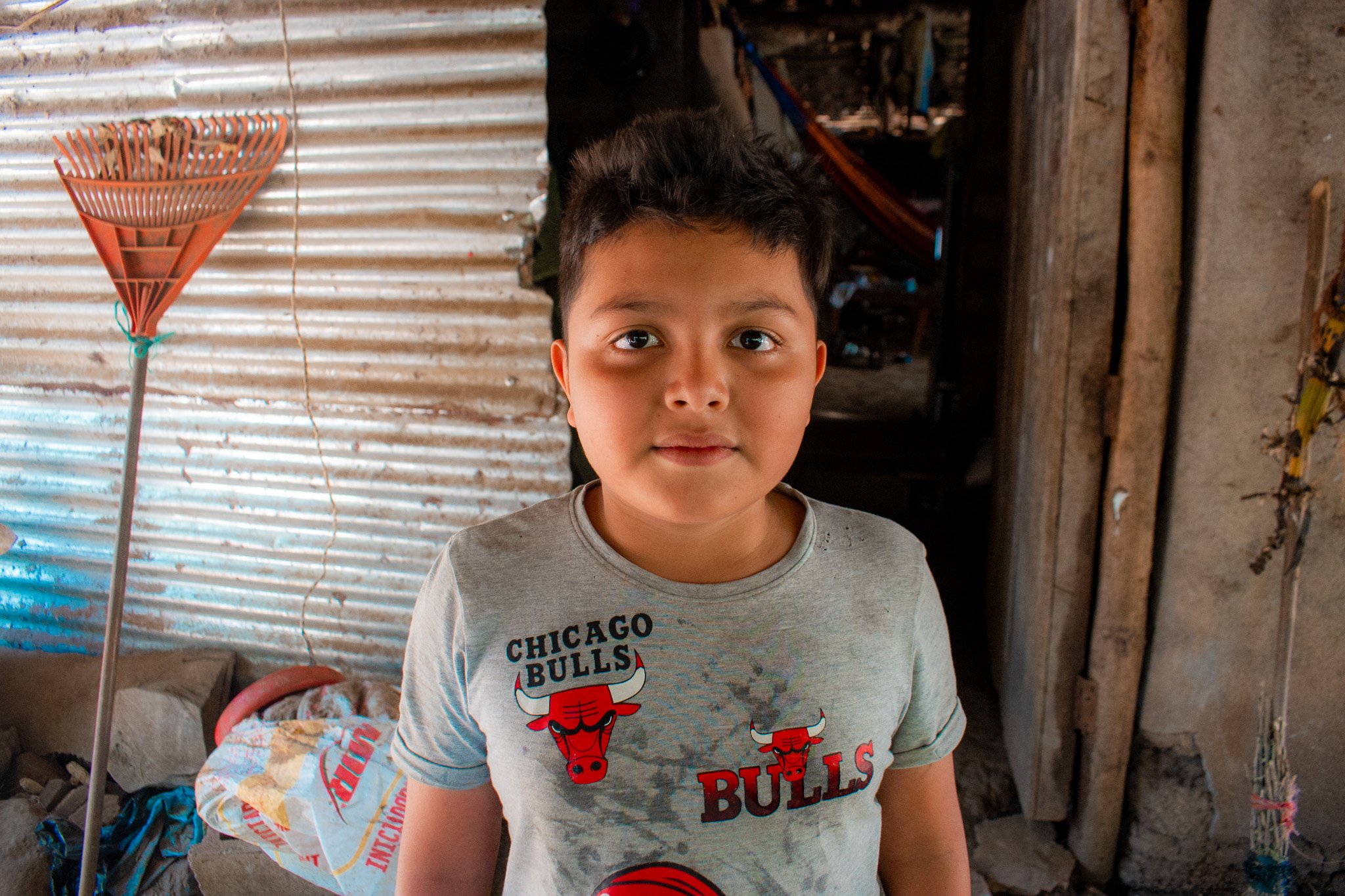 They live with four other people in the house. The house is made of adobe and metal sheets, but the walls are deteriorated. Water enters during the rainy season, and during earthquakes many things fall. The house was built 40 years ago.