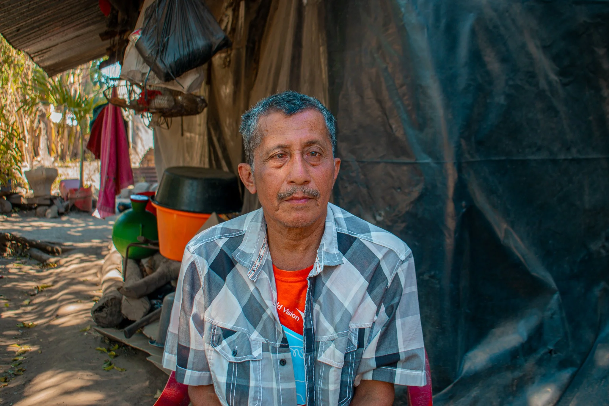 They have been living in the same property for many years , but they built the house 5 years ago, they made it using tarps, palm leaves and sheet metal for the roof, but everything is in bad condition and dusty.