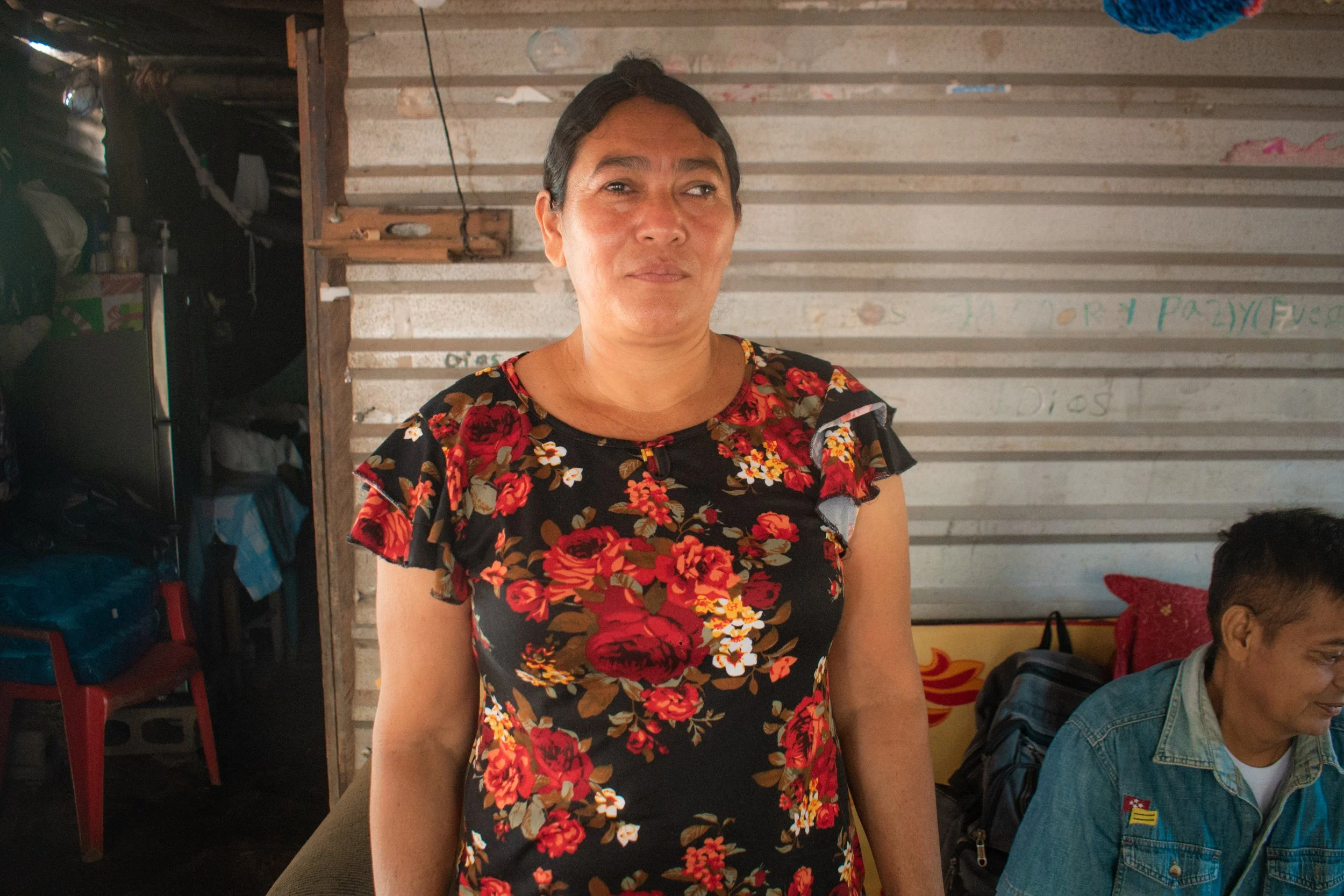 Their house is made of sheet metal and pieces of wood. They have been living in the same place for 18 years, and Blanca and her husband are the owners of the land. The posts of the house are very damaged, and the roof is collapsing due to strong winds, which causes many leaks when it rains.