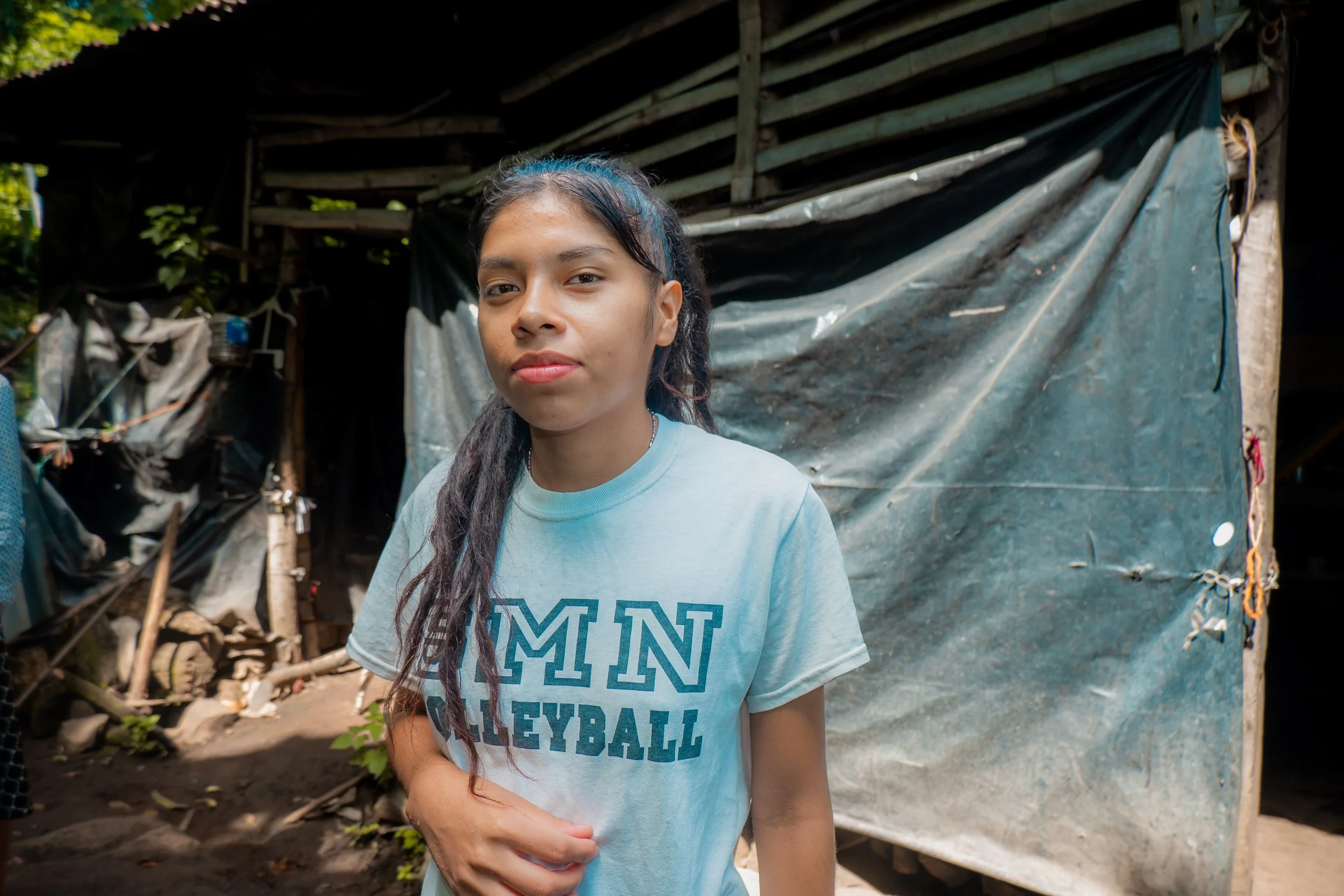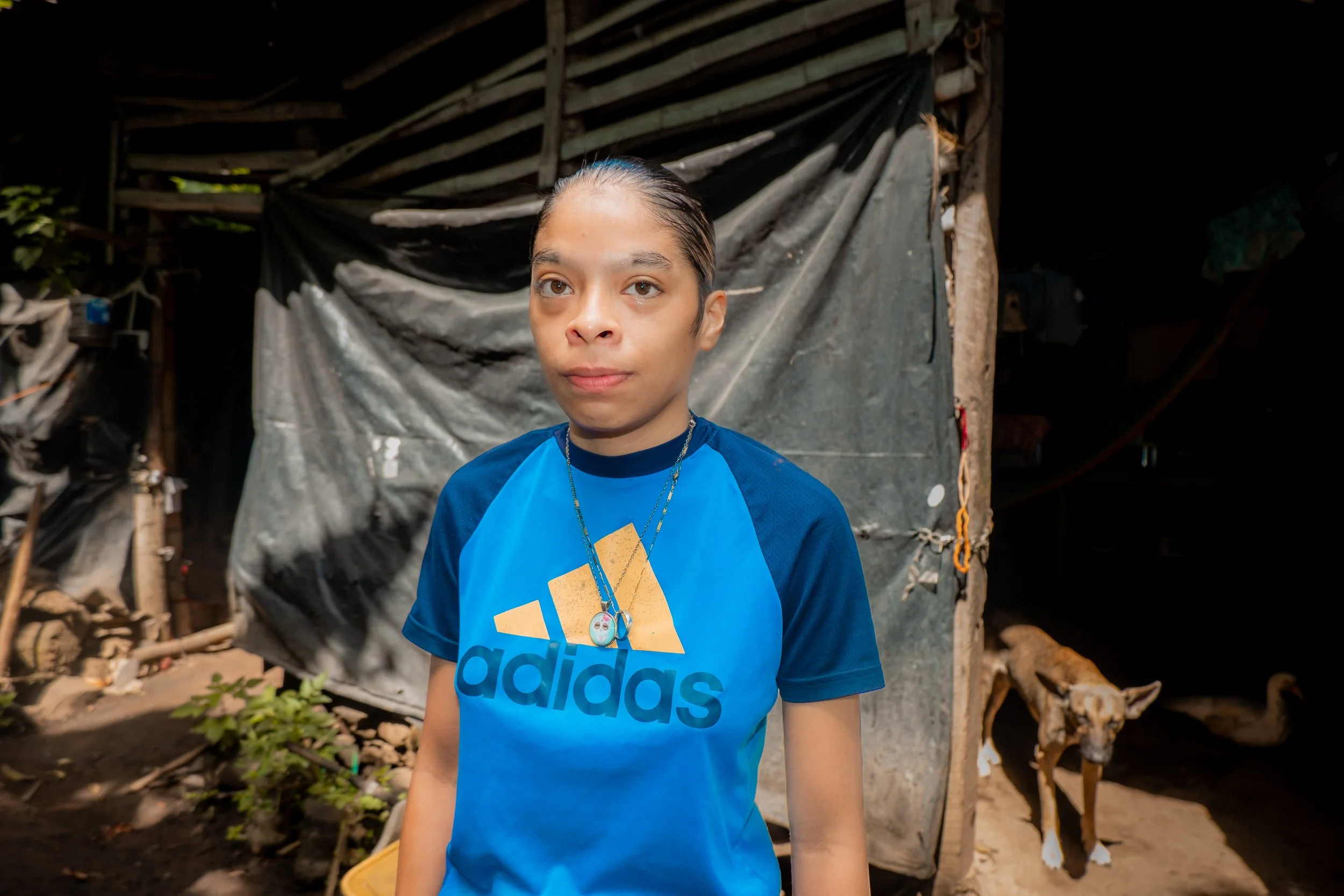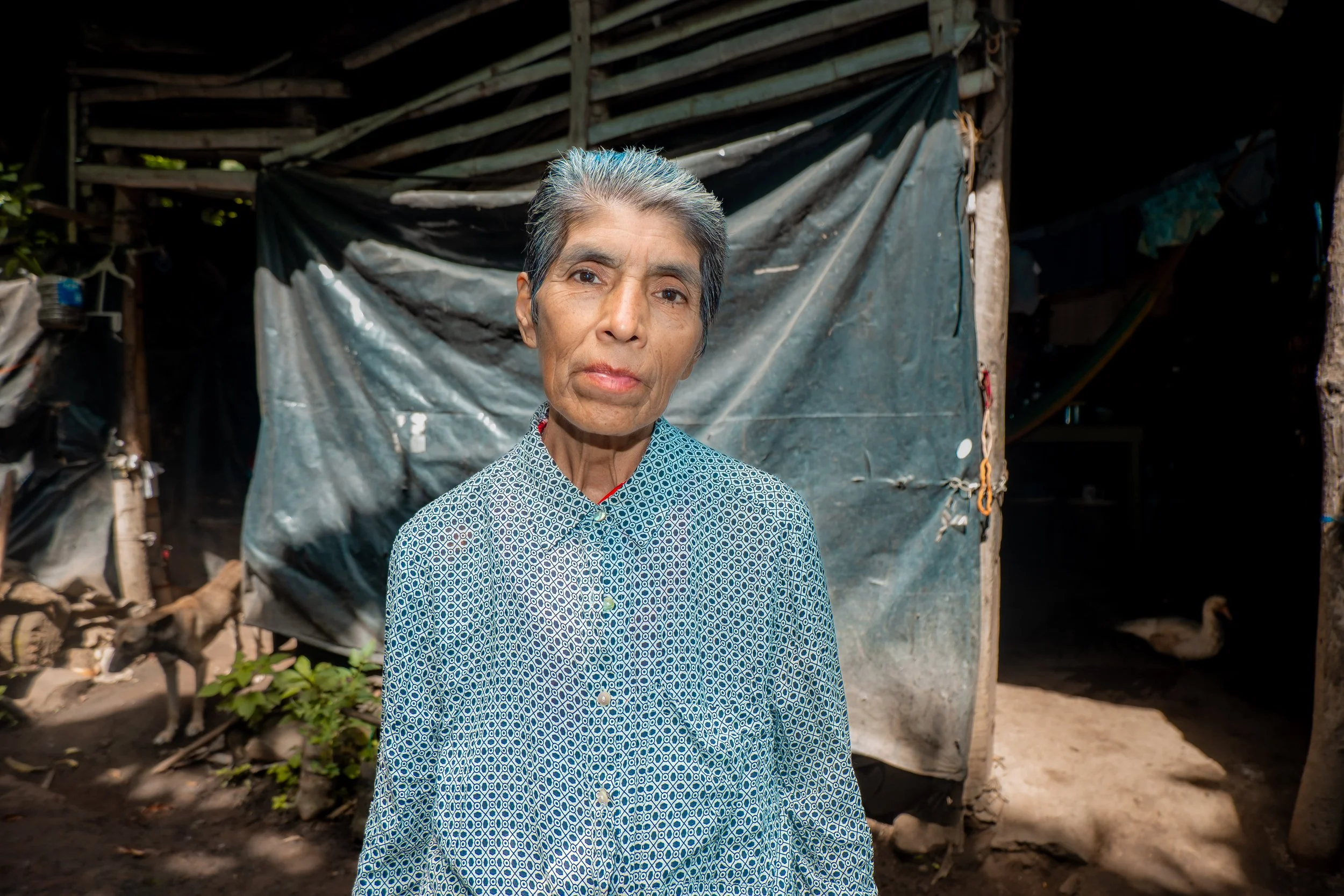 The house they live in is covered with old carpets and built from deteriorating wood. When it rains, she has to place buckets around the house to keep her belongings from getting wet, as rainwater leaks inside.