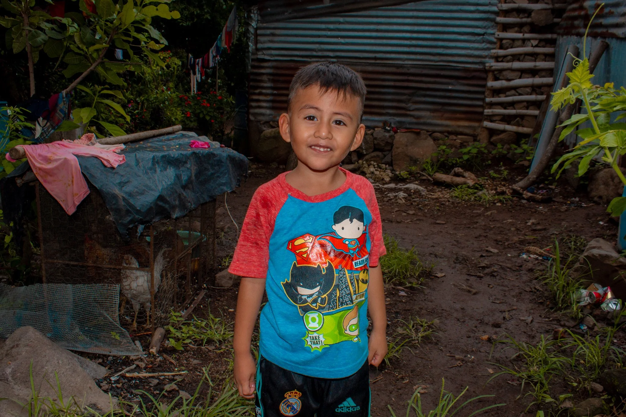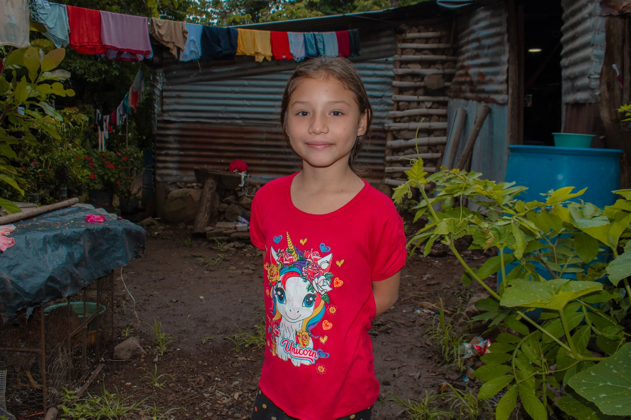 Her house is made of metal sheets, bamboo sticks, and a dirt floor; during the rainy season, water leaks through the roof and from underneath, and the kitchen is barely covered with plastic.