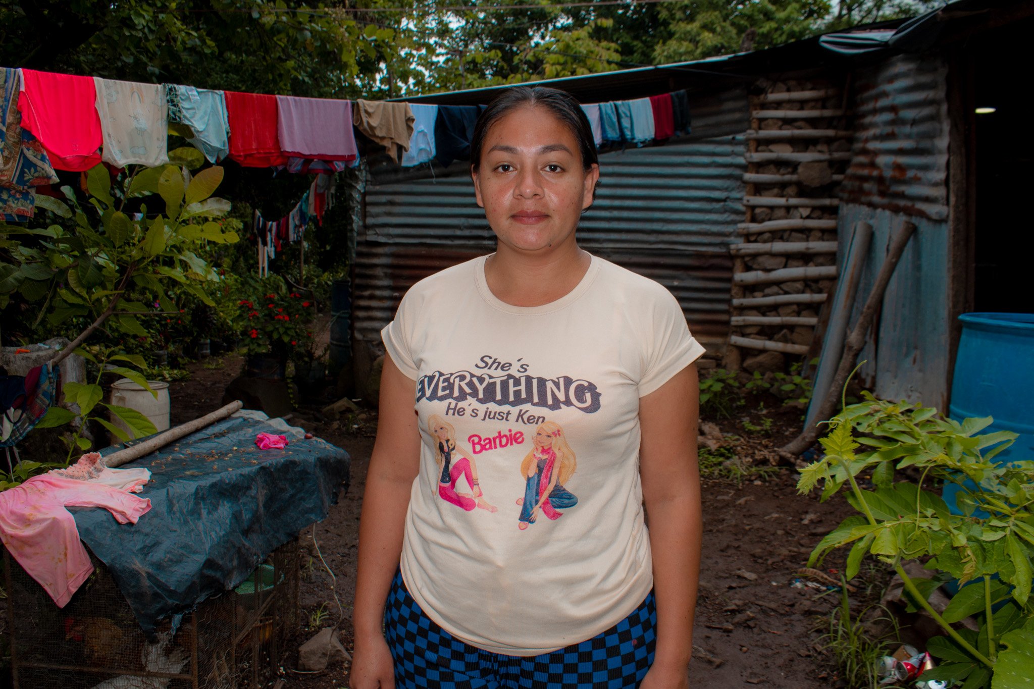 Johana sells clothes and products from catalogs, and she also spends her time taking care of her children. At home, she shares the house with seven other family members, so it can be a bit crowded.