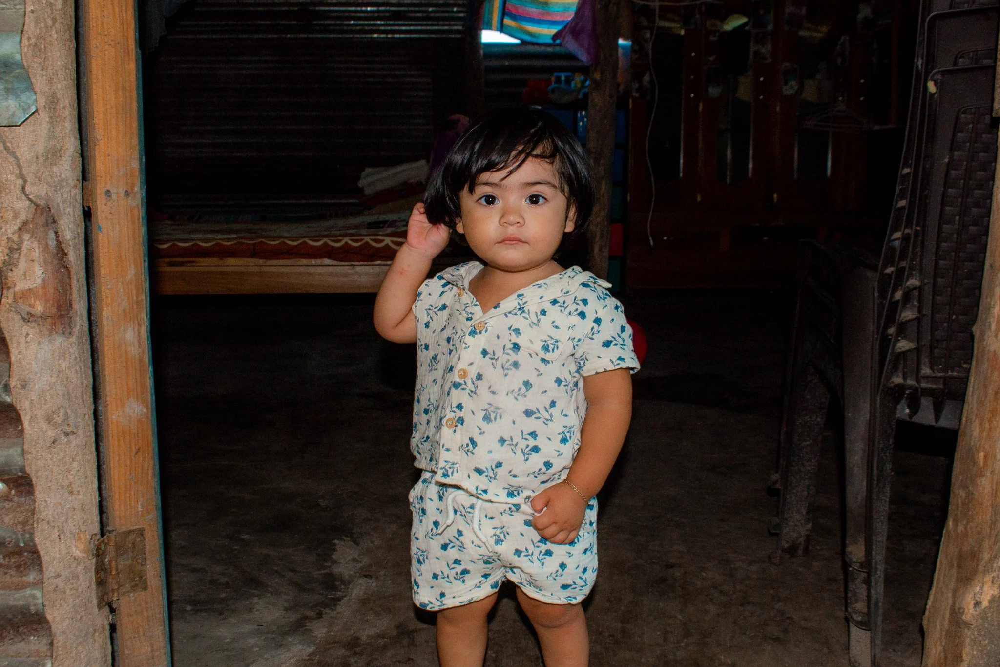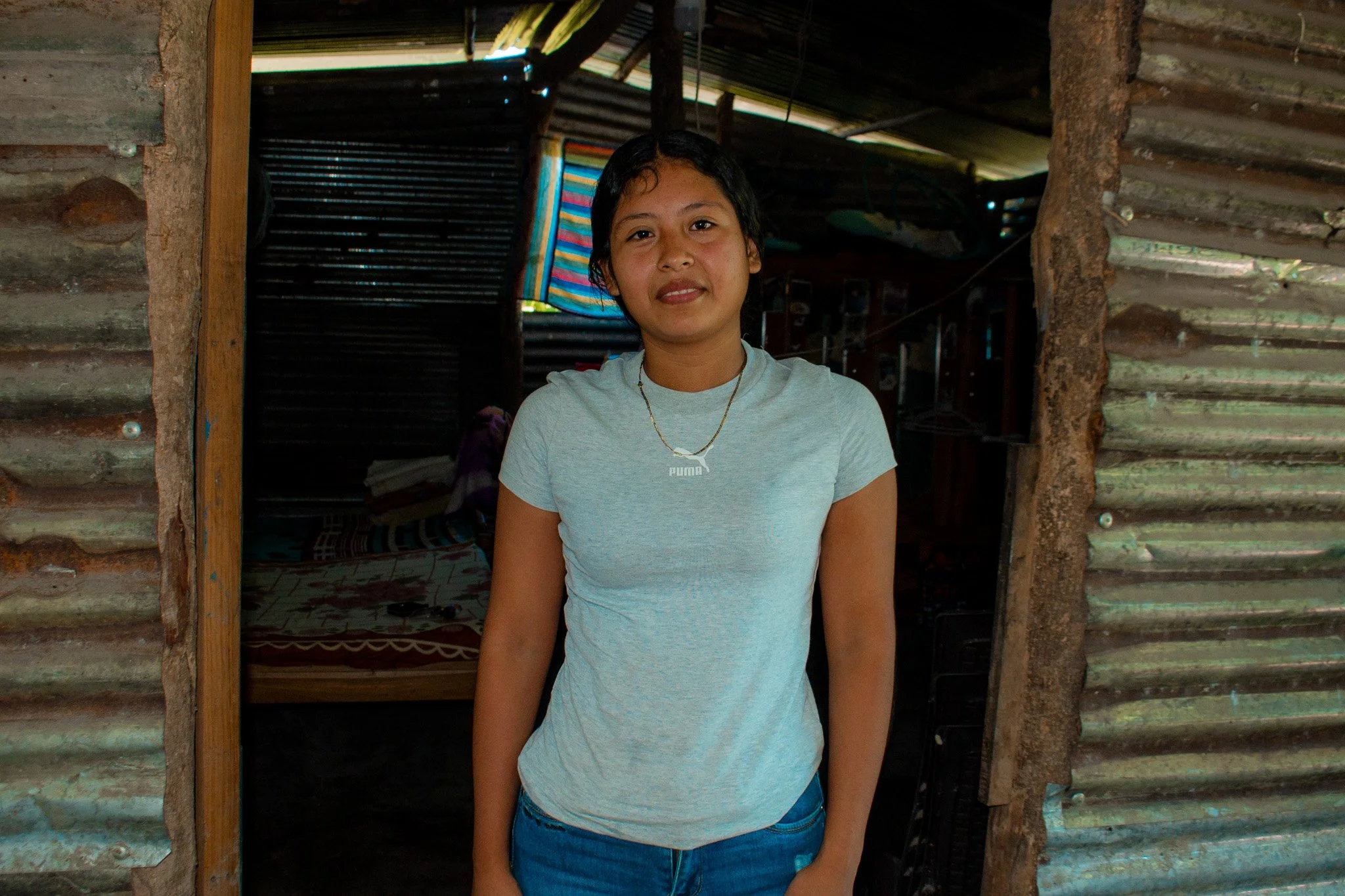 They have been living in the same house for about 2 years now, her husband built the house with metal sheets for the walls and roof and wood beams. Her father gave them permission to build on his property.